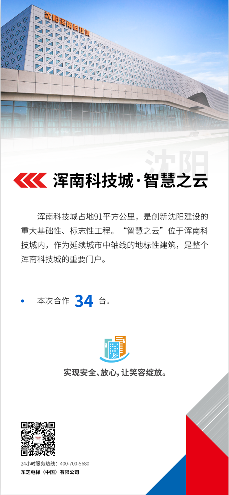 2024年7月1日,由中鐵上海局承建的渾南科技城核心啟動區正式開園,東芝電梯為渾南科技城的“智慧之云”項目提供了34臺產品,其中1350KG 大噸位客梯26臺、自動扶梯8臺。